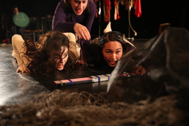 15 September 2014 — LOS ANGELES, CA — Through layers of meaning developed through simultaneous and juxtaposed text, dance, postures, costumes, symbolic props, and rhythmic movements with unison, repetition, and layering, Grand Lady Dance House reveals the fury of the often difficult journey to self-actualization as a female actor in the 21st century in Actress Fury. The fast moving, carefully written script by Jennie MaryTai Liu was performed with drive, whim, and vigor by Hannah Heller, Alexa Weir, and Liu at the Bootleg Theatre, Los Angeles, on Saturday September 13, 2014 at 4:00 pm. The work, which was supported by Live Arts Exchange and Show Box LA, had been performed previously in various amalgamations at Redcat, Pam/Highland Park, and the Bushwick Starr.