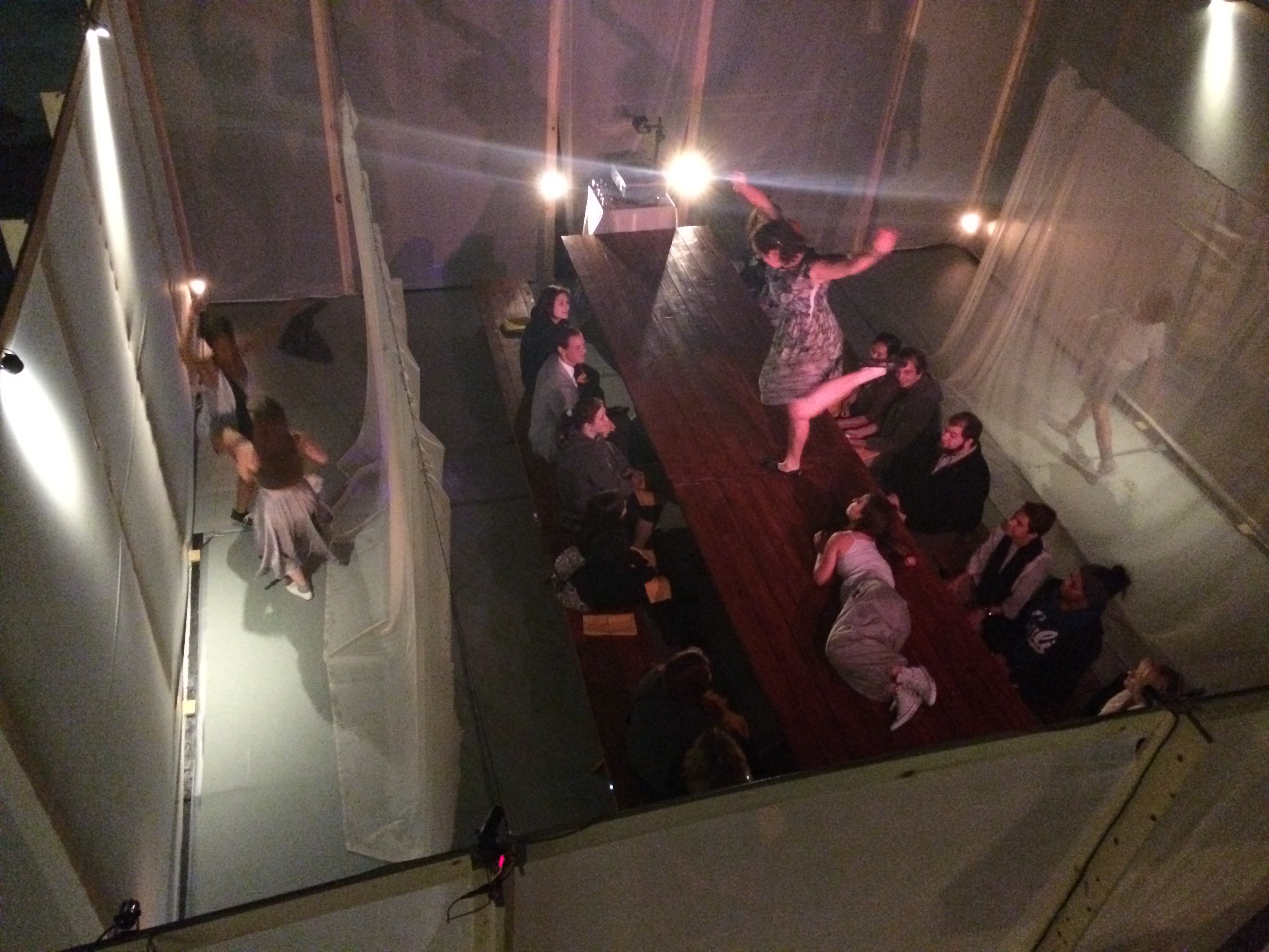 Similar to my last MFA concert experience at Cal Arts, this piece has much to discuss about the design elements, and I find myself talking about everything but the actual dancing. The movement occurred for the most part on top of the large table. This limited dance space created an interesting choreographic challenge as the dancers moved back and forth with confidence while perched three feet off the ground. Despite the fact that 90% of the dancing happened on the table, the choreography was still rich and full-bodied. The free flow of the dancers both in their solos and in their contact duets was a treat to watch. The dancers also moved naturally and confidently while telling their stories. There was a charm to the dancers, and a friendly and a happy-go-lucky feeling that was contagious for the audience. The dancers were asked to be more than just moving bodies- they were hostesses, busboys and friends. I appreciated how the dancers navigated between the phrase work and the “non-dance” performance aspects with ease. The five young women had a command of the space that was comfortable and natural.