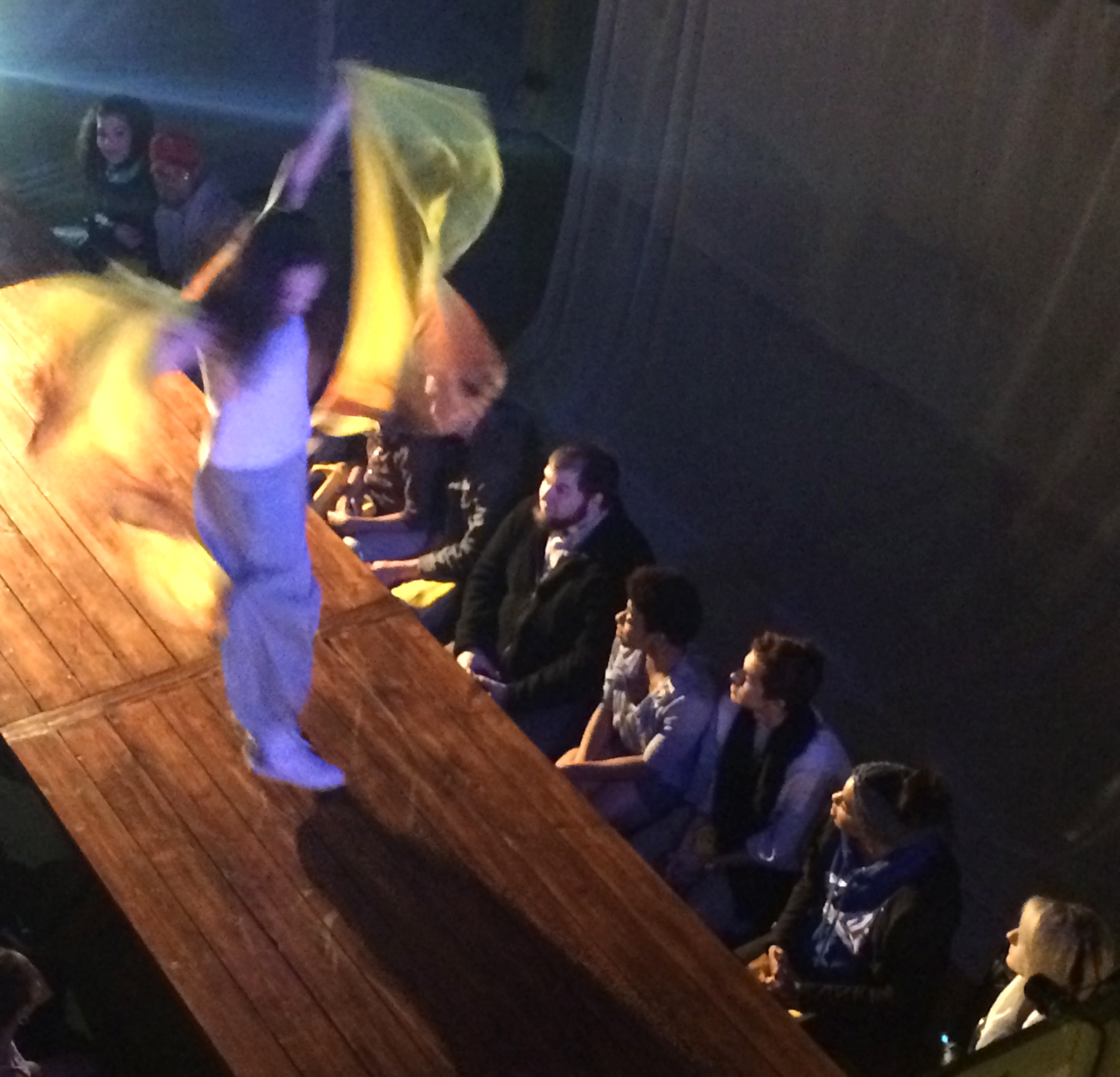 Amidst the myriad component of overhead projections, text, scarves, sounds of babies crying, and stories in a language I couldn’t understand, this work had an undeniably fresh and exciting feeling. Nothing was predictable, and I was a bit sad when it was over so soon. Despite my questions, and perhaps because of them, I wanted to know more, and, above all, I felt like I was at a party, which was — fun!