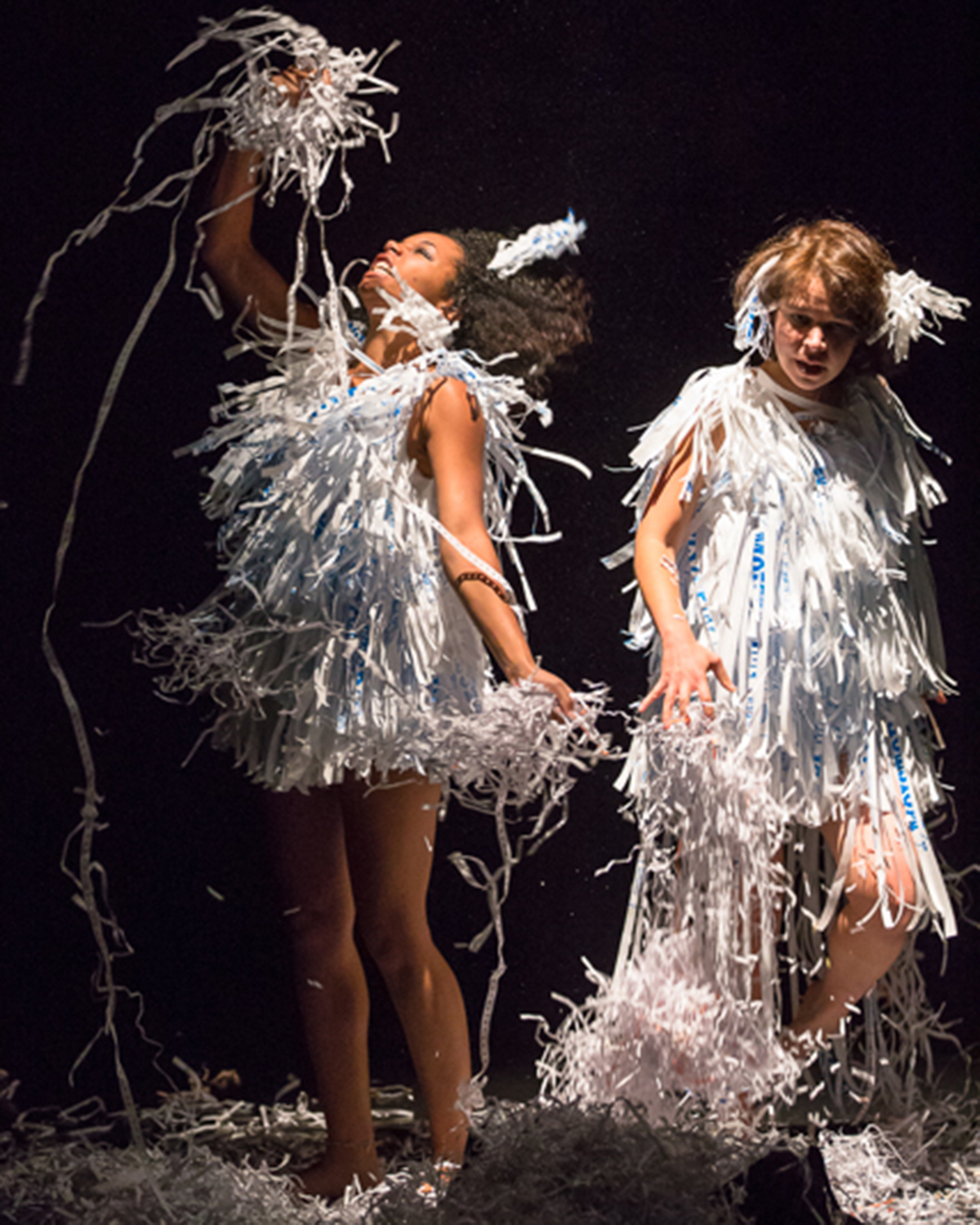 The final piece Shredded, by Kane-Parry to an original composition by Ross Levinson, began very strongly. It showed potential with its set of shredded paper stuffed into bags and scattered over the floor by Fekete during the transition between pieces. Murri Brown, Sophie Goldstein, Melanie Keller and Kristine A. Robinson dressed in shredded paper dresses, seemed to be suspended in space; hanging from their wrists. The women would return periodically to this position after bursting out into fits of schizophrenic movements; their characters sometime babbling incoherently and scratching at their bodies as if they felt bugs moving underneath their skin. The performer, whose name I unfortunately did not get, performed her mad-woman solo brilliantly. I also enjoyed the section where the four were tossing shredded paper into the air and into their mouths.