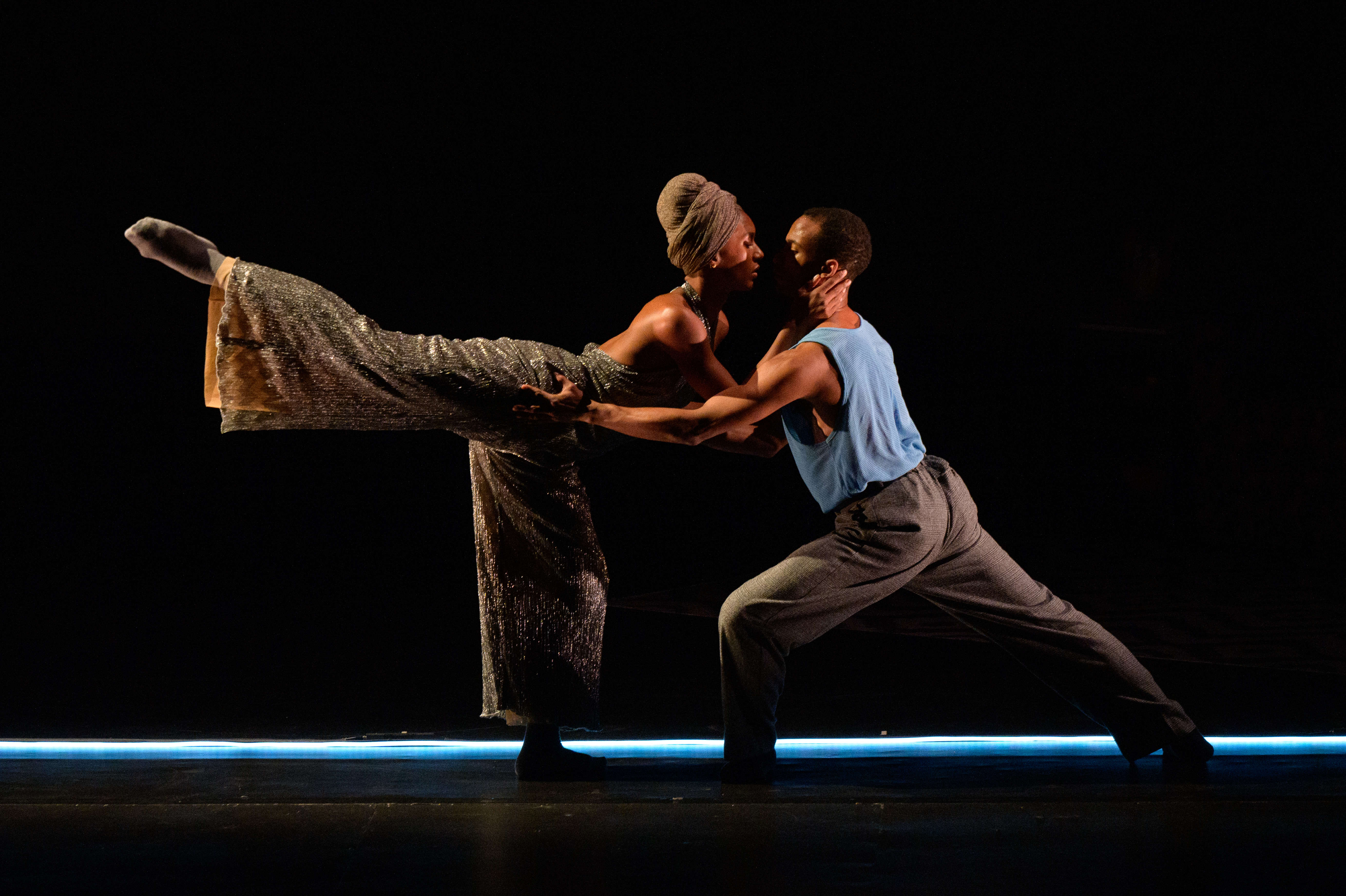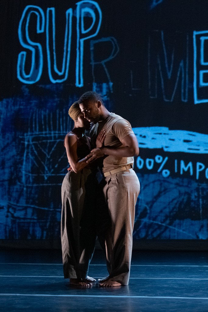 Abraham as director in turn utilized the variety in movement vocabulary and broad dynamic range to generate highly crafted movement conversations. Call and response through the body as well as through the voice. In this way, it wasn’t so much about what the dancers did, but how they felt while dancing the material. They posed questions, answered their truths, and wove themselves into the tapestry of this world. Unified by the movement vocabulary and a deeply embedded sense of timing, their individualism came out in the approach they took to the movement that in turn propelled the narrative forward. They might be looking lovingly at their partner, reflecting on an inner impulse, flirting with someone, or gossiping with a dear friend all while executing a shared movement phrase. While highly crafted, the fresh embodiment of the interactions made it feel spontaneous because it felt so real. The use of unison between partners created a contract of social connection. Combined with the use of the partner as the dancer’s focal point, the dancers were squarely rooted in a rhythmic pocket of shared togetherness. Each movement element of the performance offered insight into home life through small exchanges that evoked not only characters but also places, relationships, personal, and cultural values. Bursts of athleticism or technical prowess– a sustained inversion, multiple pirouettes, balances in extension or dynamic contemporary floorwork– did not dominate the narrative landscape but conveyed the tremendous skill and facility of the dancers while driving the work forward and maintaining the complex textural fabric of the stage. In this way, each detail contributed to the ethos of the work.