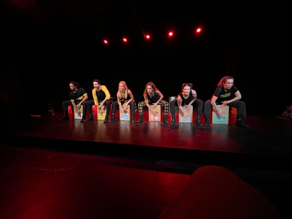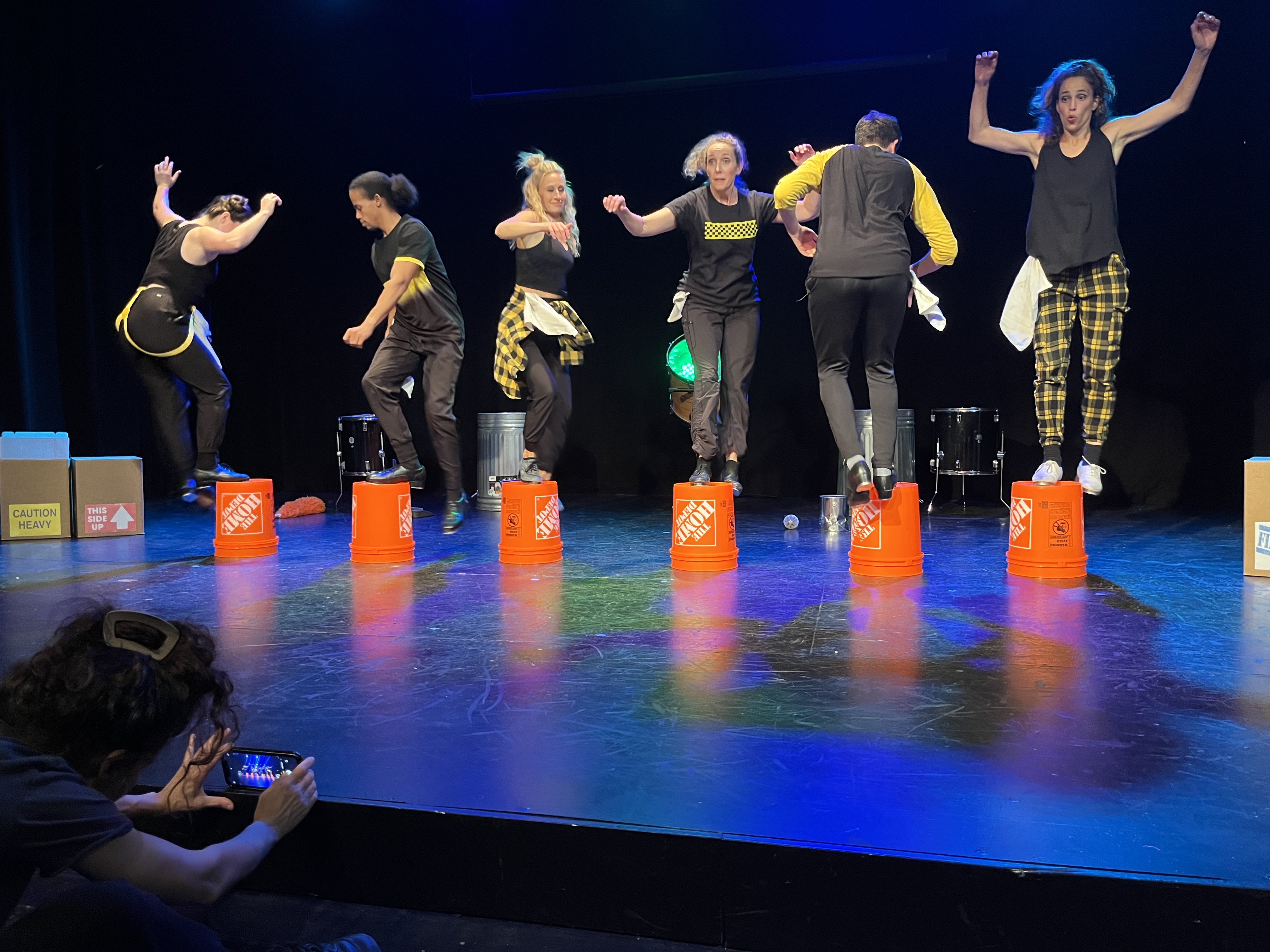 With only 15 minutes to transition into the space, Fringe performances have to be organized and prepared to load in and set up their show in record time. Rhythm Delivered was tightly crafted in this aspect, using the whole team to set the stage with the needed tools, instruments, and props to be utilized throughout the show. Five gallon buckets on stands, cardboard boxes, cleaning supplies and standing drums made for a great landscape to this STOMP-like show. The cast of 6 dancers (Noa Barankin, Dani Behrens, James Larose, Tara Lauritsen, Dylan Lohmeyer, and Carina York), dressed in black and yellow, evoking an urban feel to match the industrial props and scenic styling.