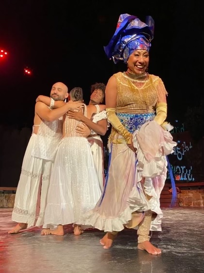 The show ended with one final rebirth, as the dancers reemerged to cumbia rhythms and the unmistakable vocals of Celia Cruz. The dancers once again embraced life, drawing sweetness from their souls, from each other, and from the hope of a new future. The cast of community performers rejoined the core group of nine dancers in a closing ritual, growing the cast of diverse bodies and backgrounds into the narrative of resilience and rebellious celebration. The cast spilled into the house and invited the audience to dance with them before sealing the evening with an extended sound bath and Q&A.