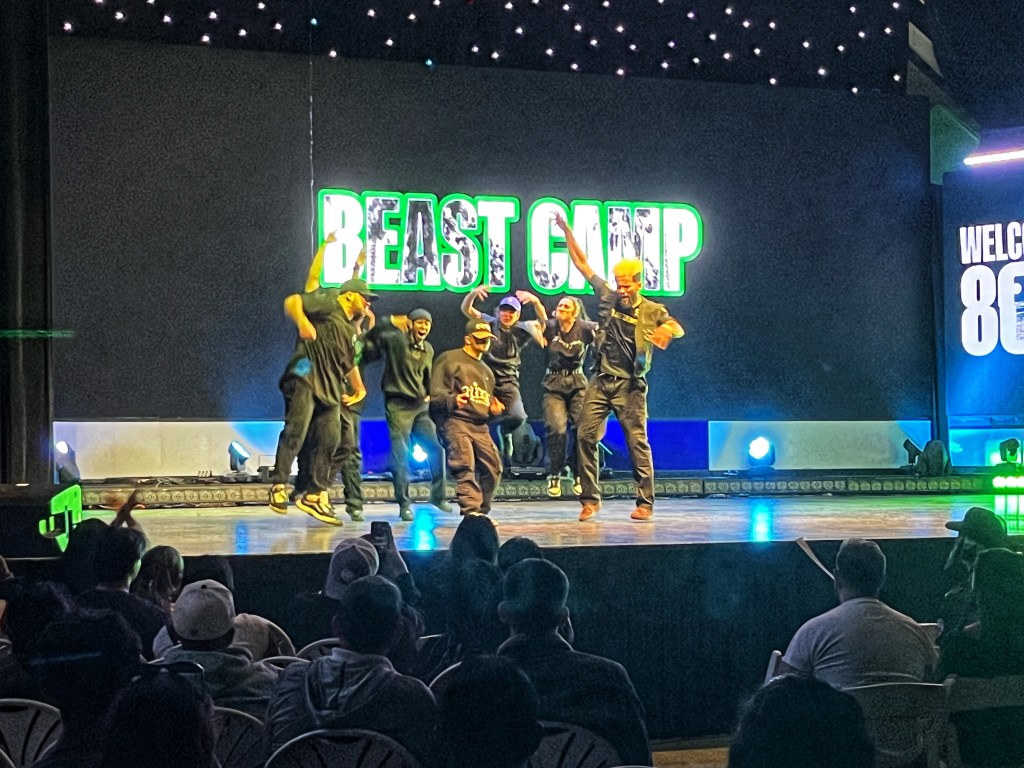 I attended the evening showcase, arriving to a packed house as people enjoyed dinner and drinks from local food trucks and vendors. This was my first event of this nature, and while I have a strong background in early vernacular Jazz dance, I am largely unfamiliar with contemporary hip-hop culture and the increasingly popular vehicles for competitive and commercial hip-hop, such as Hip Hop International and World of Dance tours. I attended to learn more about the industry and to honor the artists who largely work outside of the “traditional concert dance setting” but are relentless in pursuing their craft and artistry. With the stated goal of love and inspiration, the show was uplifting and supportive, with a casual, community feel that was above all welcoming.