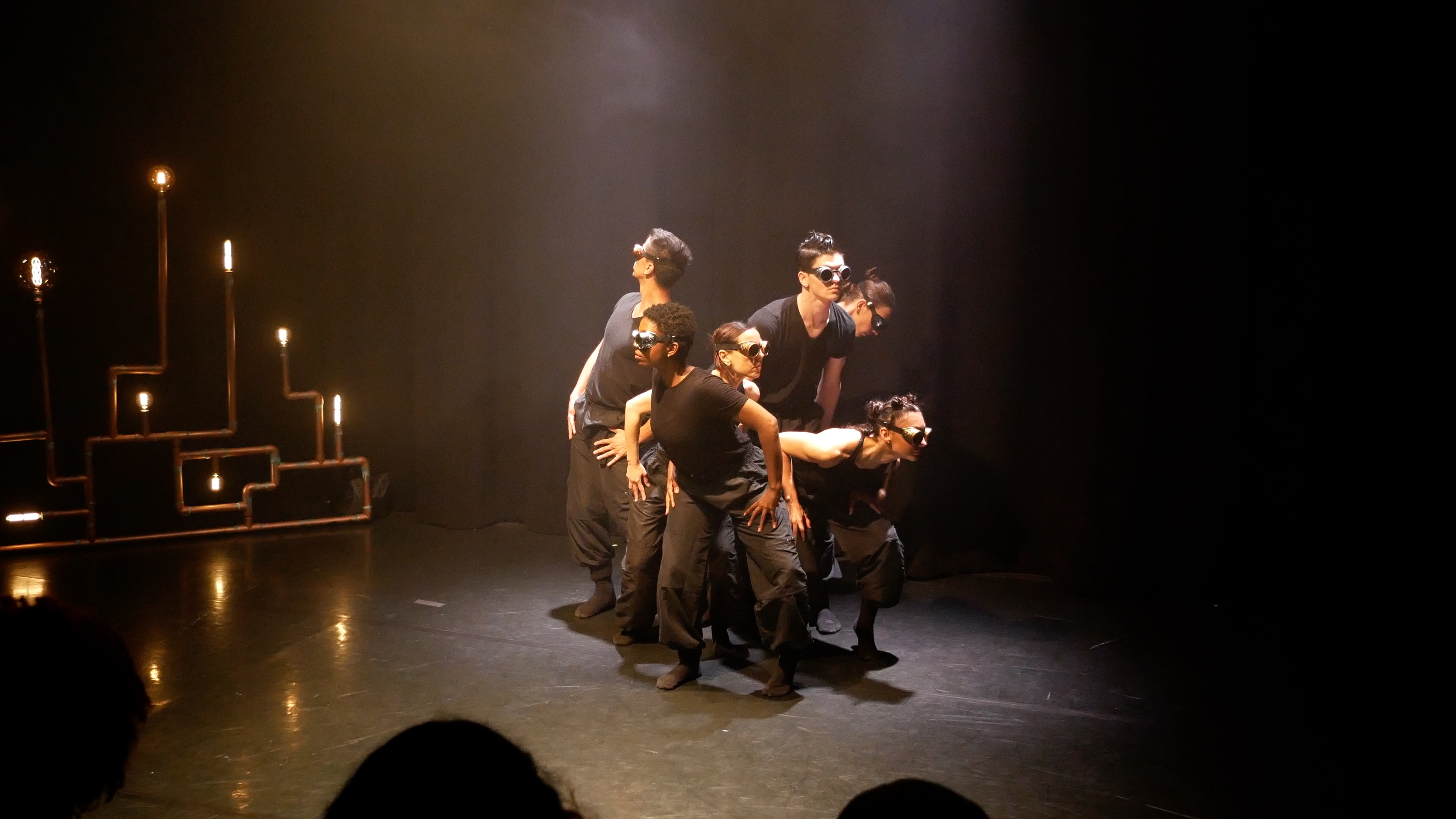 The opening section, entitled Endless Cycles, was an elegant construction of gestural phrasing using theme and variation. Shrugging shoulders, slicing hands, jerking arms, and mechanical torsos built a post-apocalyptic world in a Matrix style. The set dressing by Adam deFelice included a network of metal piping and incandescent bulbs that evoked an era of grit and ingenuity. The aesthetic matched and amplified the industrial feel of the steampunk goggles and sleek hair styling worn by the cast. Simple black t-shirts and tank tops worn with black pants and socks added to the uniform nature of the cast and the minimalist design of the world they were building together. The performers wore flat, serious expressions but broke into feverish shaking, scratching, and writhing, showcasing a clear breaking point in the rigid structure they had established through the gestural phrases.