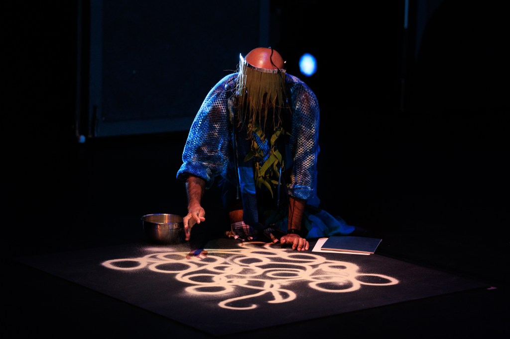 This piece had so many design components that it is hard to recreate in words: there was video of Murugesan lying like an underwater mountain, images from Dravidian celebrations, and news footage of politcal unrest sequenced one after the other; there was a sand drawing by D’Lo in the downstage right corner balanced by an altar of woven baskets and items in the opposite corner; there was repetitive stepping movement performed by Attar and Hari; and there was prerecorded underscoring for the duration of the work. The result was a somewhat overwhelming collage of media, but collectively had a timeless, watery effect, as one design element seeped into the next and blended with what came before and after. It was, at times, disorienting, but I appreciated how this boundaryless approach to the performing arts contrasted strongly with the distinctly curated qualities of the preceding work. IT seems Murugesan was sharing a piece that was as much a ritual experience as it was a performance.