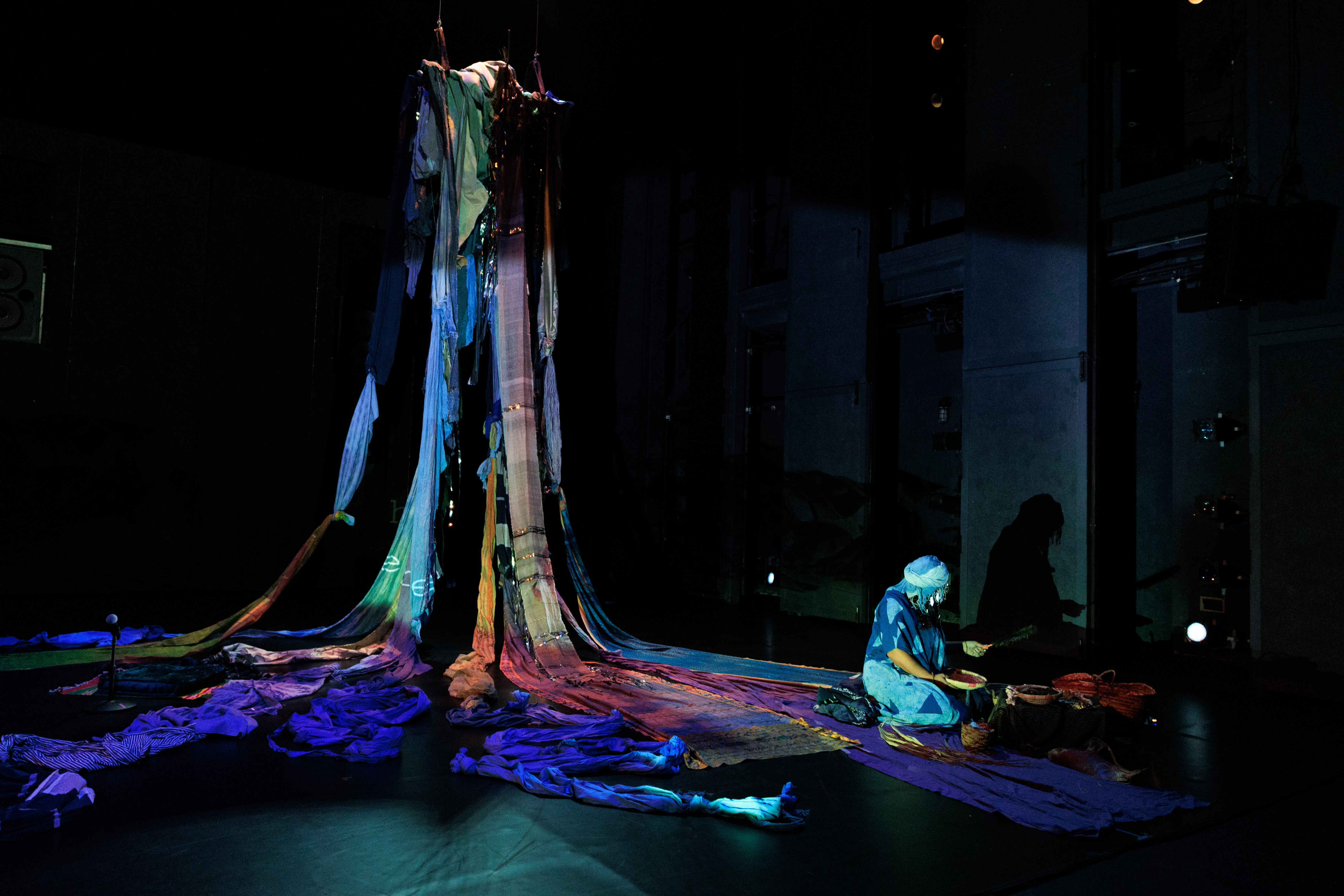 The immersive experience arguably began before the performance itself, as the REDCAT crew reset the stage in blue light, accompanied by ocean sounds and prerecorded storytelling about a harbor seal’s responsive ability to slow its heartbeat while diving. This extensive transition featured the hanging of a large textile sculpture like a seaweed forest, resembling a tent with tendrils stretching across the stage floor, creating a submerged environment. While the transition facilitated a shift into a somatic and even metaphysical approach to art-making, it ended up taking some of the attention away from the work itself.