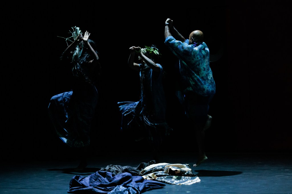 The deep blues and aqua lights by Chu-Hsuan Chang suited the underwater world being created, illuminating the figures while keeping the projections on the back wall clear. The work’s many elements risked being diffuse, but Murugesan’s collaboration with dramaturg d. Sabela grimes resulted in a piece with both visual and sensory consistency. While the words didn’t convey a strict narrative, the piece clearly told a heartfelt story from these artists.