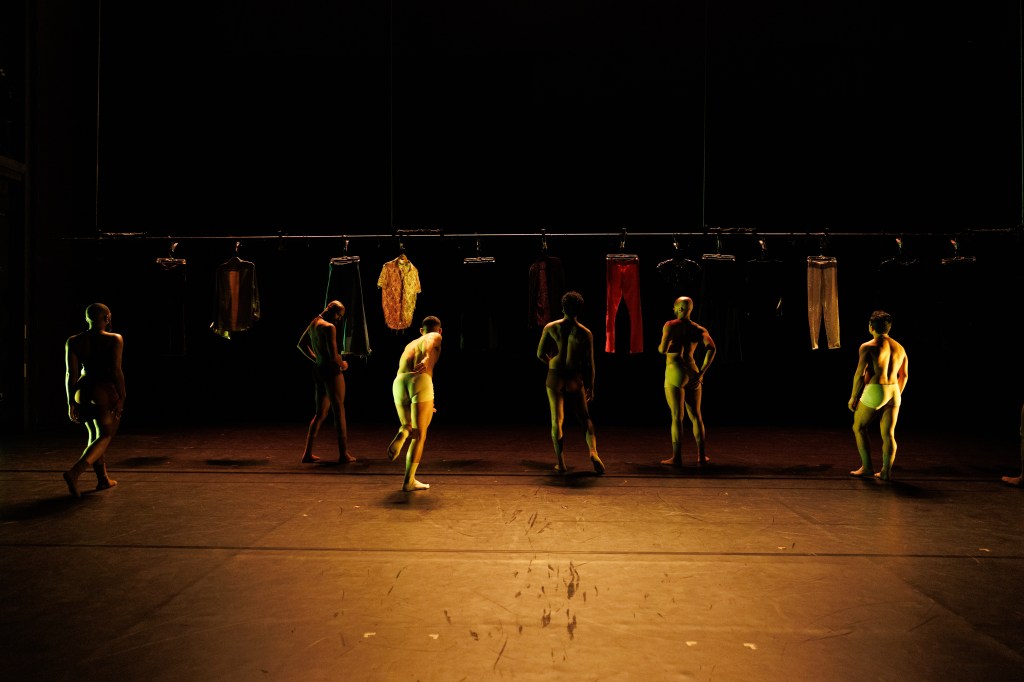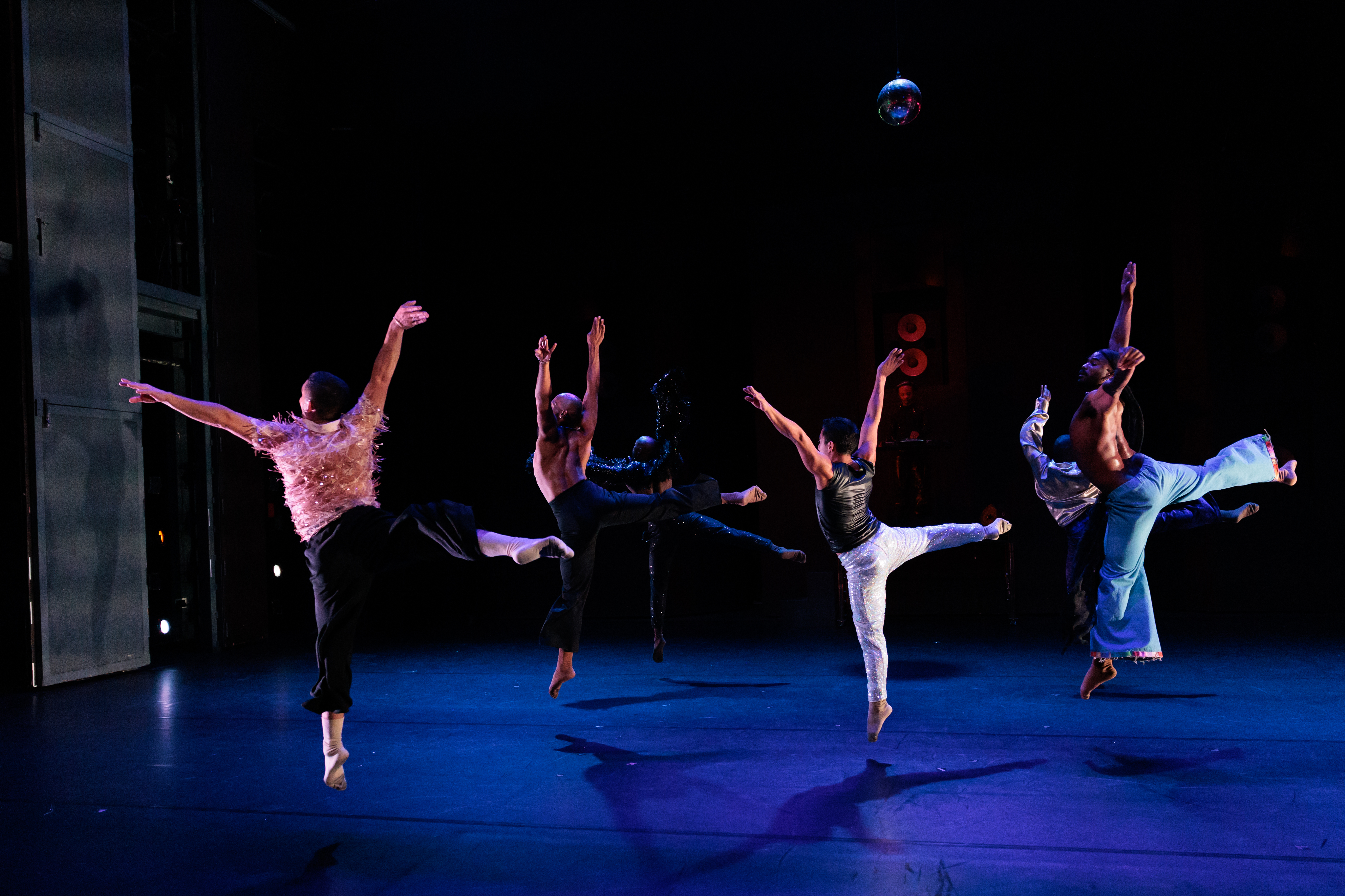 A lone figure stood facing away from the audience in a spotlight (lighting by Chu-Hsuan Chang) and slowly walked backward downstage before turning to engage the audience with direct focus and sensuous energy. The remaining cast appeared scattered around the space, some close together, heads and pelvises near, others watching from the shadows. The pre-party moment was intimate and provocative, with dancers in flesh-toned shorts and one showcasing an incredible durag by Damon Green. After the pre-party vibe, costume designer Arrington Fleming dressed the dancers in flamboyant club clothes including sequined jackets, bell bottoms, oversized coats, and hot pink sports pants, delivered on a motorized line that acted as a literal closet for the fashion-forward characters. DeFacto X set the tone with music that propelled the action forward with a strong disco vibe.